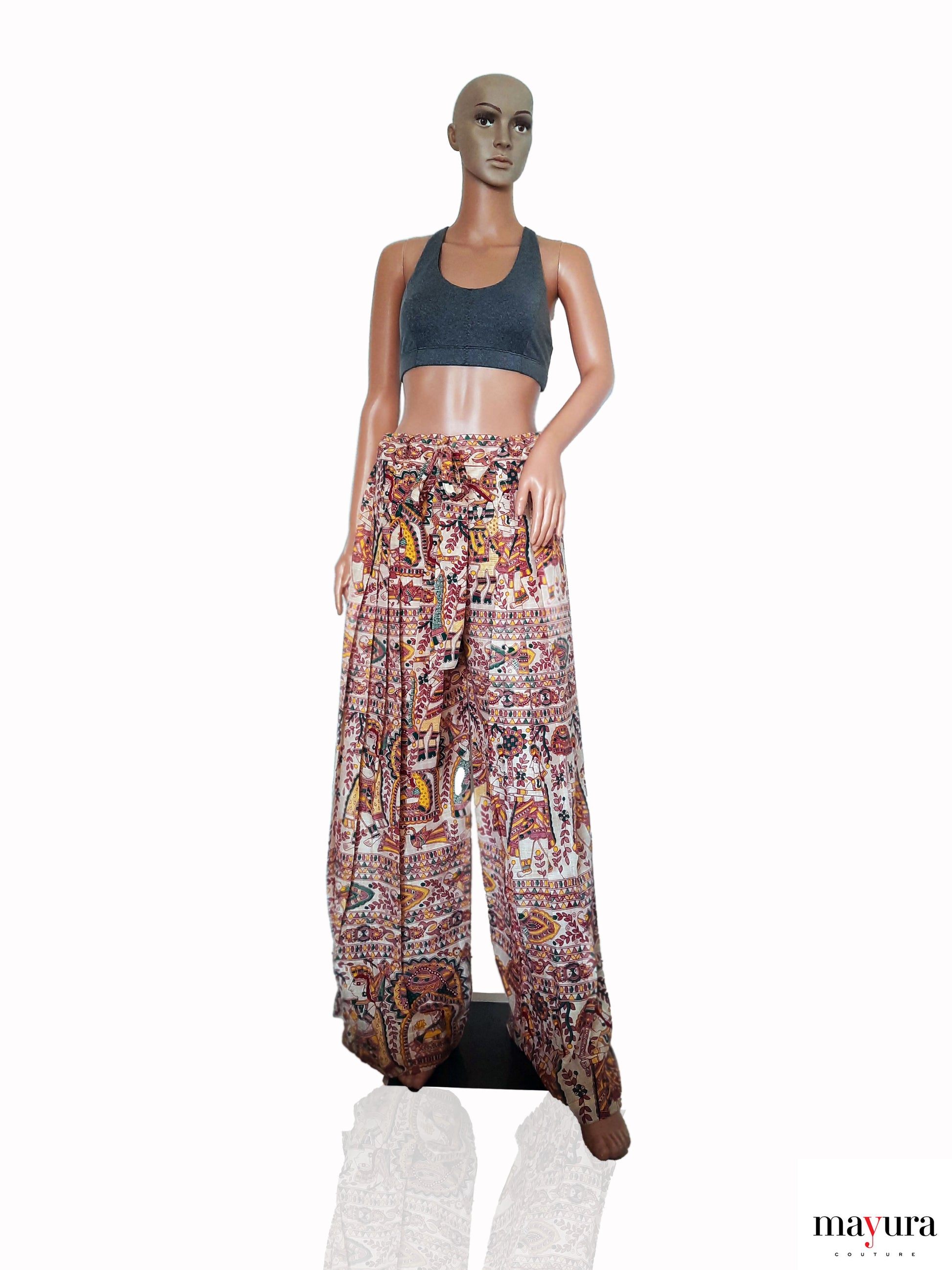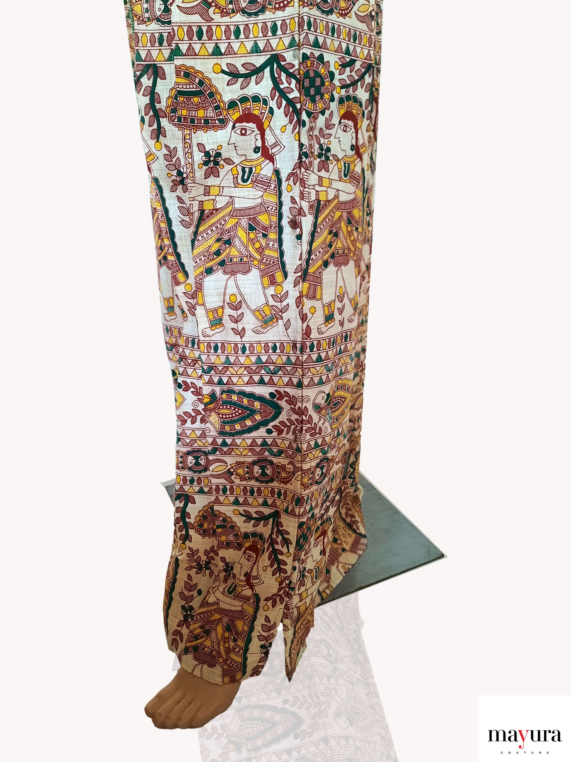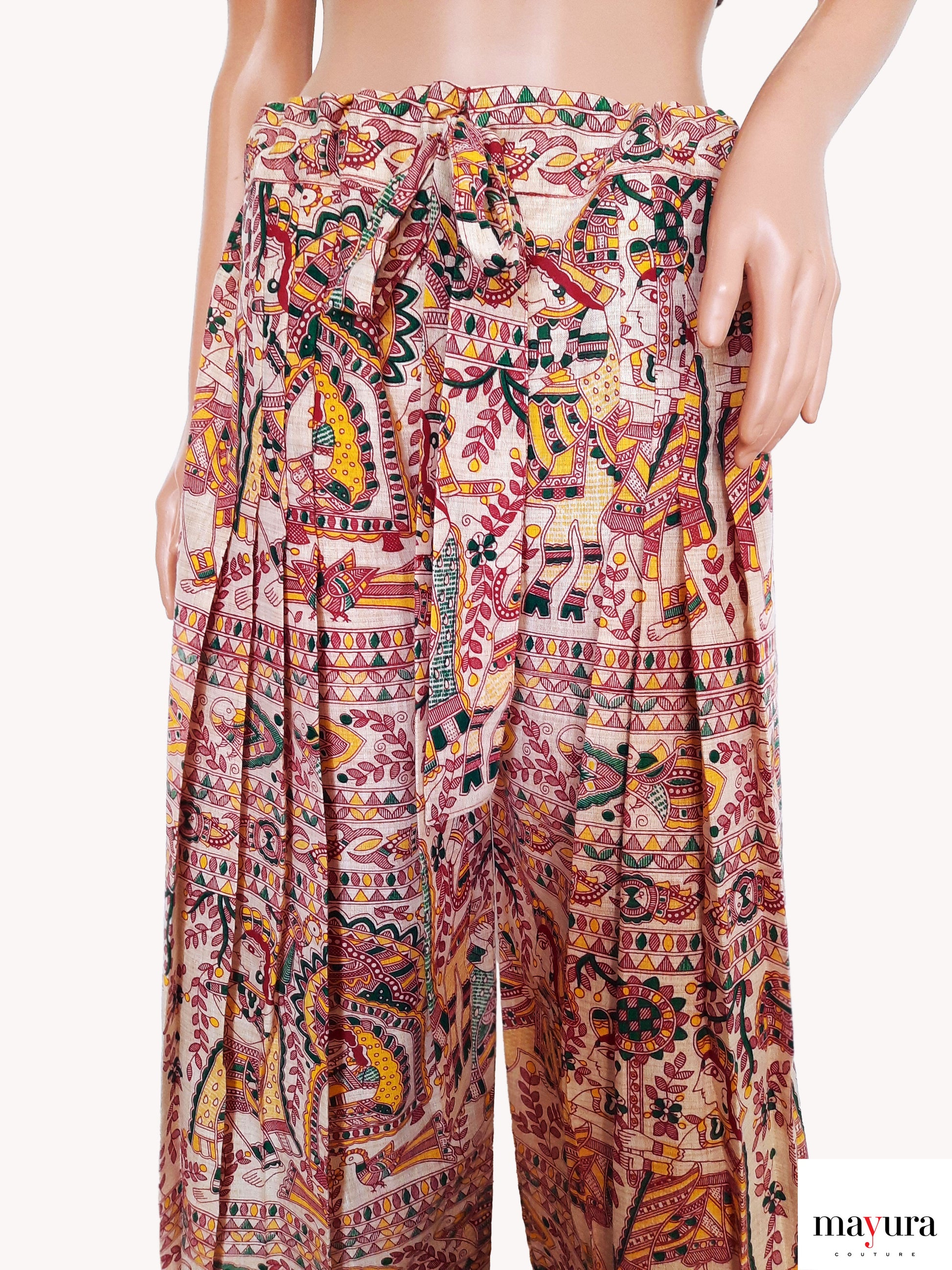 These palazzo pants combine the timeless beauty of Madhubani art with a modern wide-leg cut, perfect for women who appreciate comfort without compromising on style. The vibrant red, yellow, and green wedding procession motifs on a beige base make this piece a wearable work of art. Whether you're heading to a festive gathering or an elegant evening out, these palazzos ensure you'll stand out.