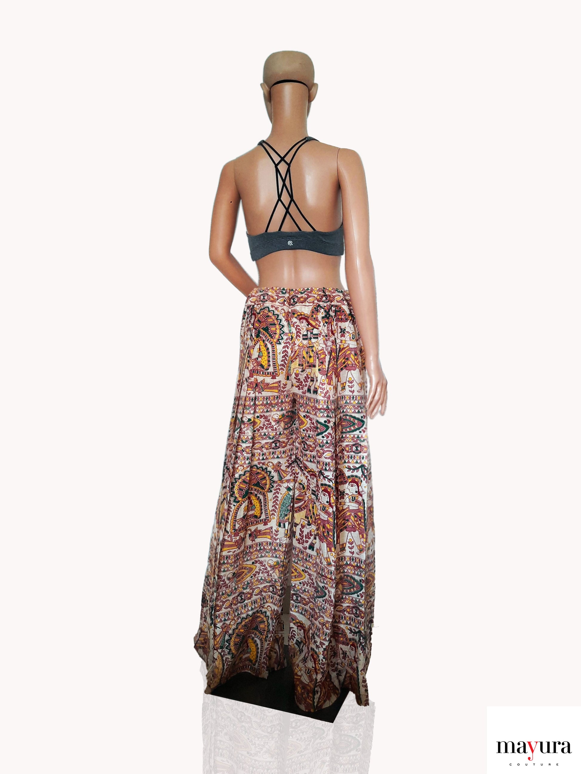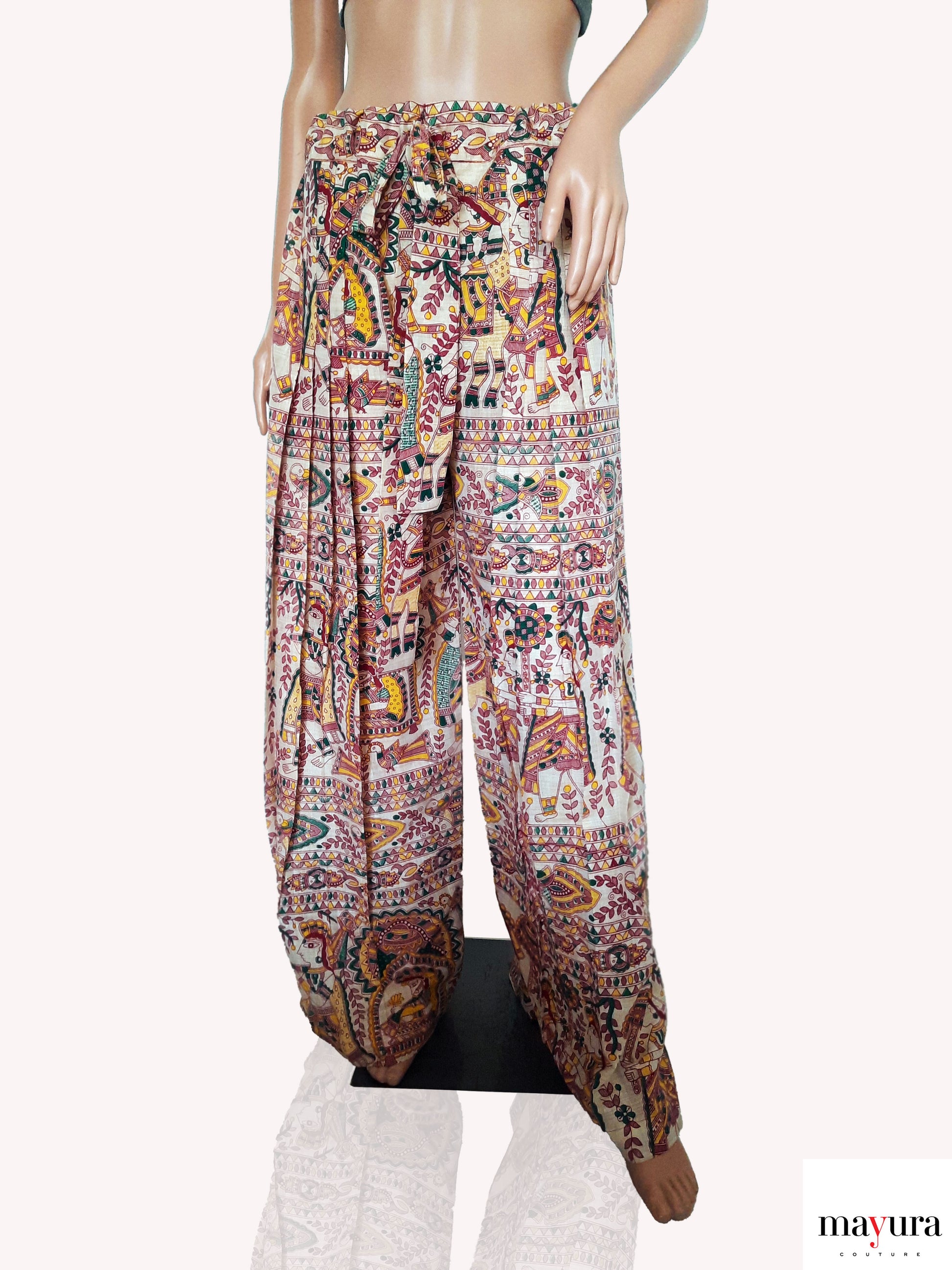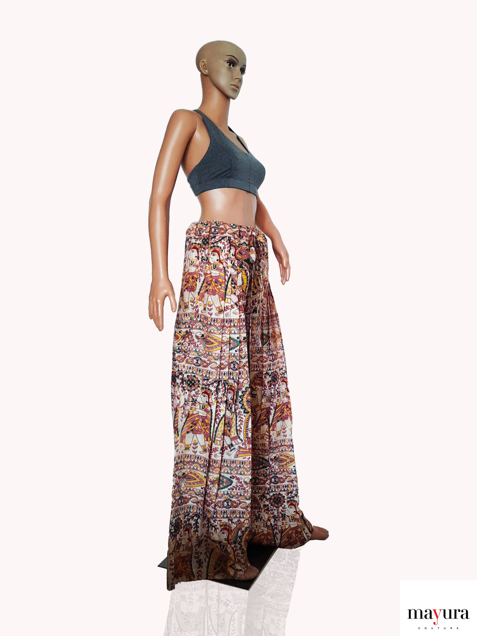 These palazzo pants combine the timeless beauty of Madhubani art with a modern wide-leg cut, perfect for women who appreciate comfort without compromising on style. The vibrant red, yellow, and green wedding procession motifs on a beige base make this piece a wearable work of art. Whether you're heading to a festive gathering or an elegant evening out, these palazzos ensure you'll stand out.